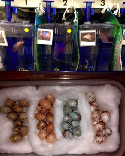 Lots on the go in the lab at the moment. Trying to establish the dominance hierarchy in the 35 male Siamese Fighting Fish, and measuring conductance in tiny Prinia eggs, kindly on loan from Claire Spottiswoode at Cambridge. |