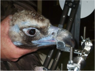 This susceptibility is due to a combination of a small visual field, large brow ridges and the behavioural trait of looking down when flying. This suggests these vultures have reached a limit as to what is possible in the sense of propensity to change, and they will not be able to overcome the sensory challenges posed by large man-made structures being placed in their flight path where no natural structure would be present. Measuring visual fields doesn’t harm the birds. They sit in the dark with their bill resting on a small metal platform, while you walk around them shining a light into their eyes to assess, via retinal light-back, where they can see and where they can’t see. From this you can measure blind spots, and where binocularity is present (read more here).